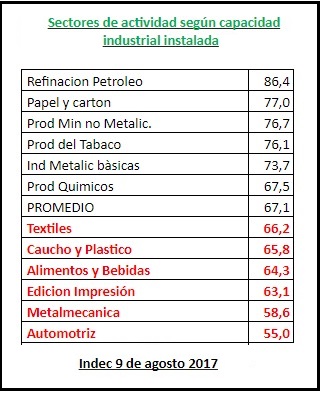 El Indec presentó su informe sobre capacidad instalada de la industria donde informa que el promedio del mismo se encuentra en un 67,1% mostrando así que a pesar del leve repunte, aún existe en el sector industrial una elevada ociosidad.