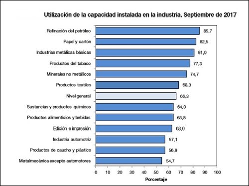 Durante el mes de septiembre de 2017, el promedio de la industria alcanzo el 66,3% y en la medición los bloques sectoriales que presentan niveles de empleo sobre dicha capacidad tenemos a las siguientes actividades: