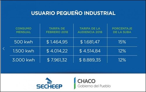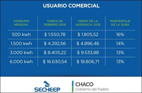 A casi dos meses de su presentación, el Poder Ejecutivo provincial aprobó los nuevos costos tarifarios presentados por Secheep en la audiencia pública celebrada el pasado 8 de febrero. Los nuevos montos comenzarán a pagarse por los usuarios chaqueños recién en septiembre de 2018, ya que serán aplicables desde los consumos de abril, los cuáles se pagan recién en esa época del año. Además entra en vigencia la tarifa rural.