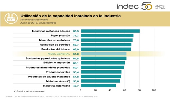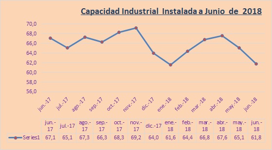 Como puede observarse en el siguiente cuadro de evolución de la capacidad industrial instalada al mes de junio de 2018 el mismo arribo al 61,8% uno de los valores más bajos en doce meses de trabajo.