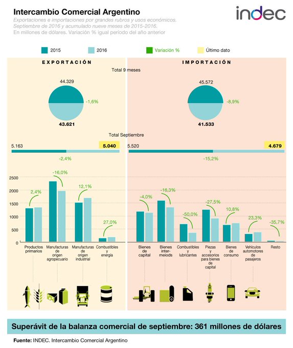 Comercio exterior: superávit de US$ 361 millones en septiembre de 2016. indec.gob.ar/uploads/inform…